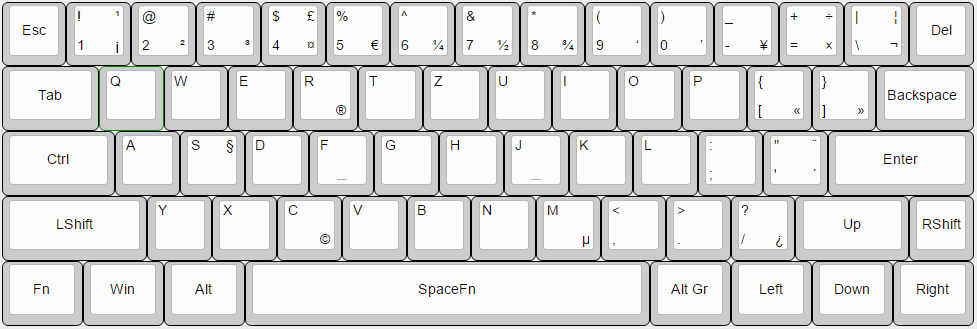###0.0 Languages The US-International Layout is currently required for the support of non-english languages. This keymap swaps Y and Z to provide the familiar QWERTZ position for characters when using that layout. All diacritic characters are input by either holding Space or Fn and pressing the corresponding key. For languages that aren't yet supported explicitly, one can also use AltGr to input the characters as intended by the US-Intl layout or the dead keys, if they're kept from being revived.